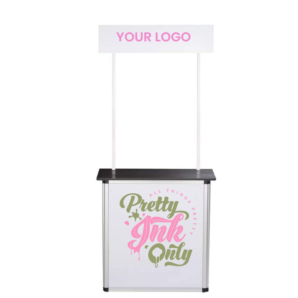 Podium table features detachable frames and boards for foldable use; carrying bag for portability and easy transport; widely used on trade shows, exhibitions, traveling presentations, in-store displays, retail stores, shopping malls, great for introducing products and distributing samples